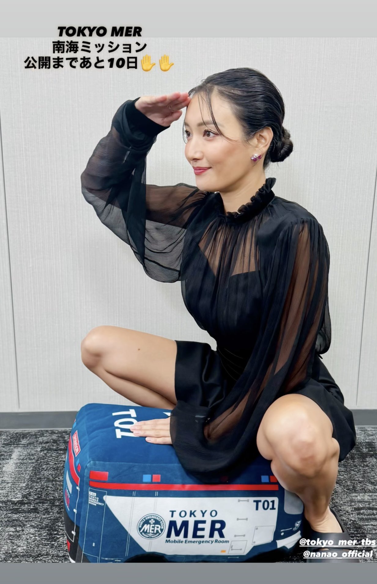 菜々緒さんはXを更新し、「TOKYO MER 南海ミッション。見てほしいな。公開まで、あと10日」と、自身が出演する映画を告知し、『黒の透けドレス姿』で美脚を大胆に見せた最新ショットを披露しました。